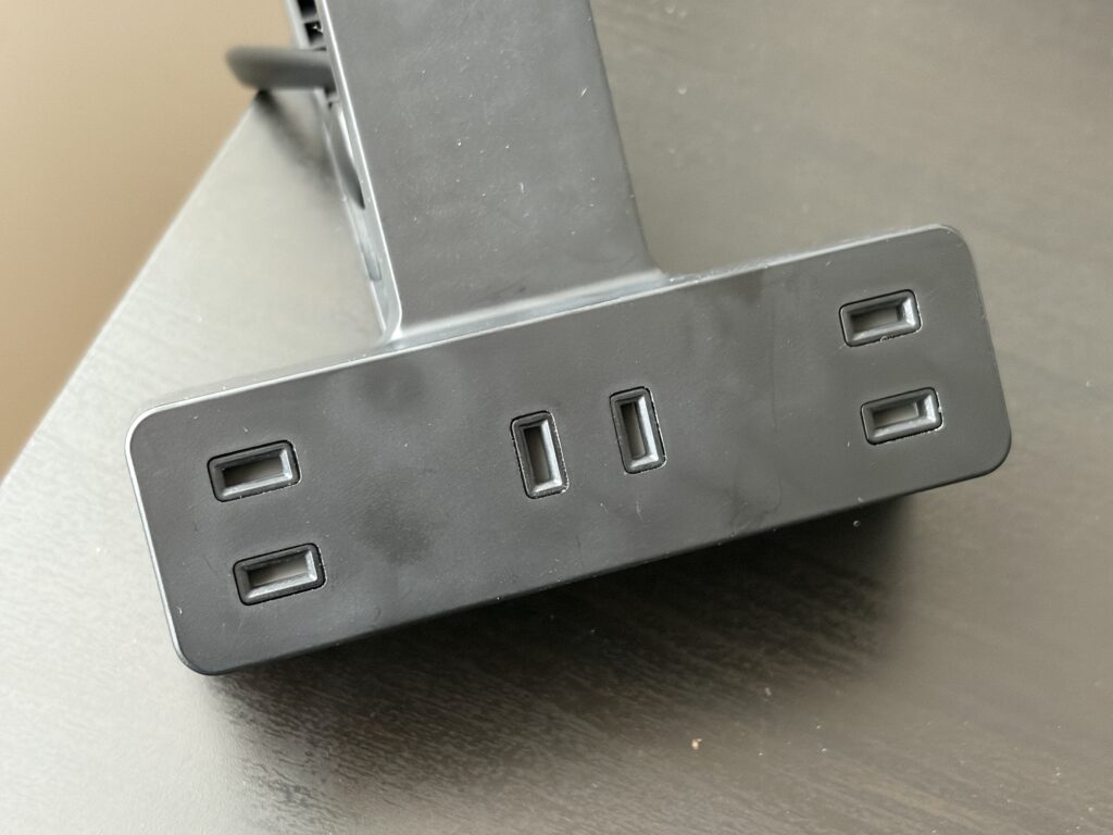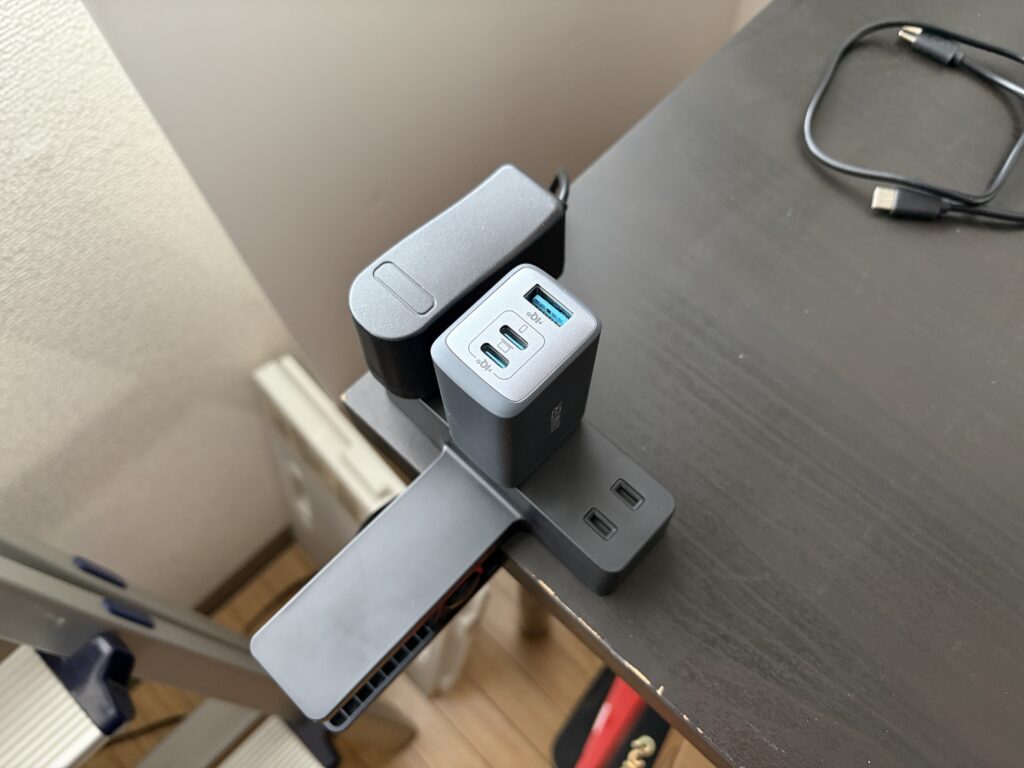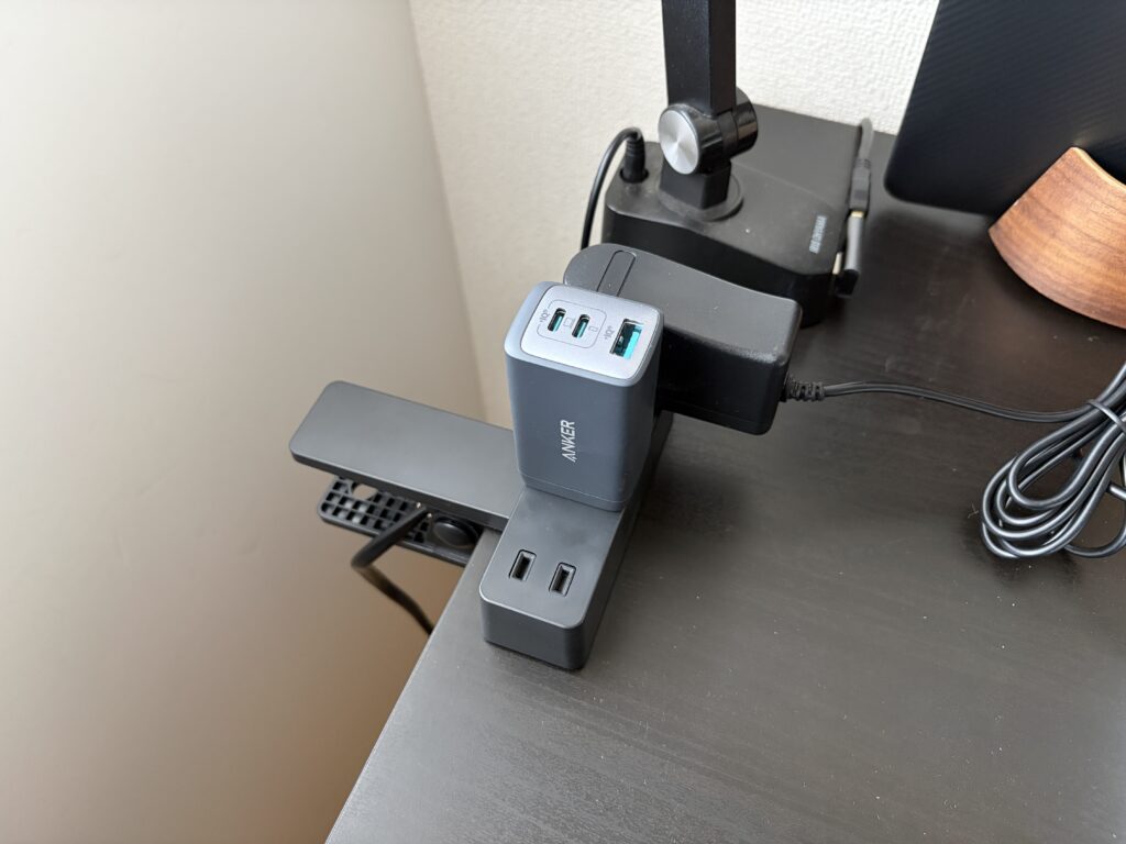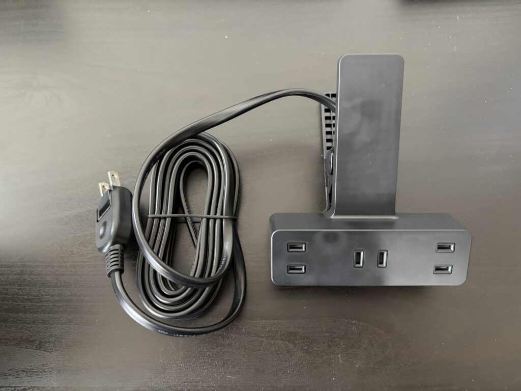 デスクの天板に挟んで固定できる電源タップで、「手元で使える電源」というのが非常に快適でした!