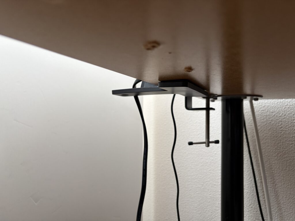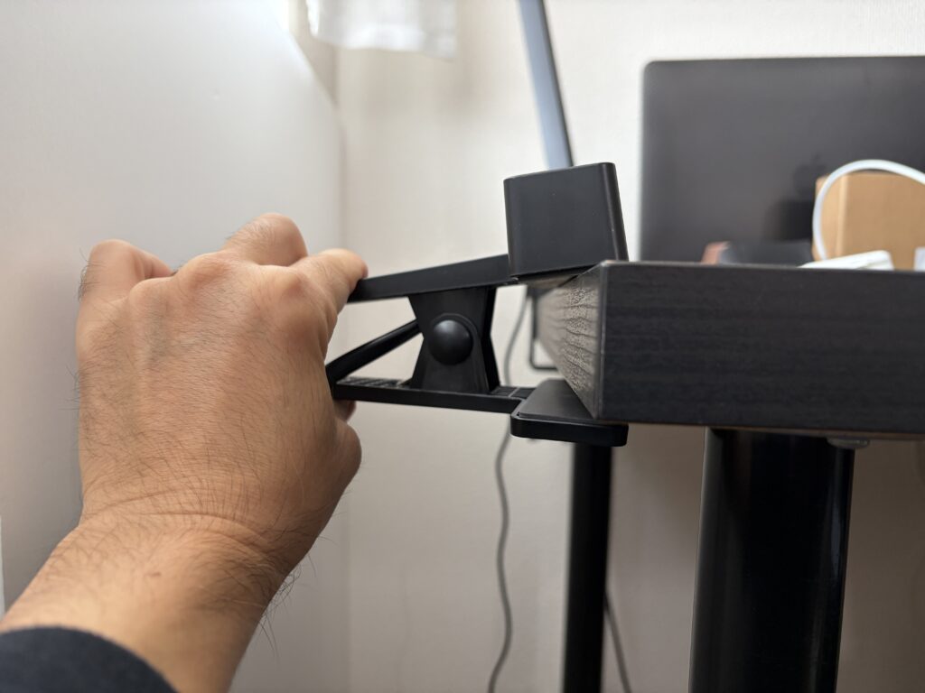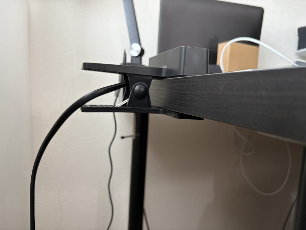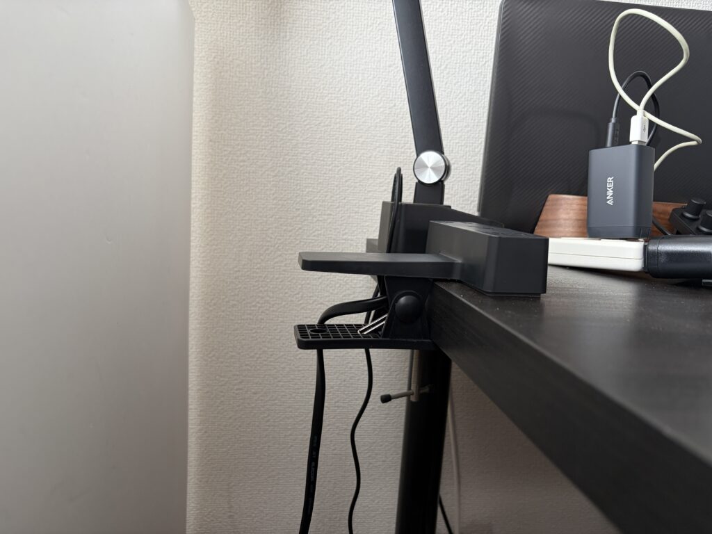 ただし、クリップ部分が結構奥行きがあるので、デスクを壁ギリギリに設置する場合は、壁と干渉するので注意が必要です。