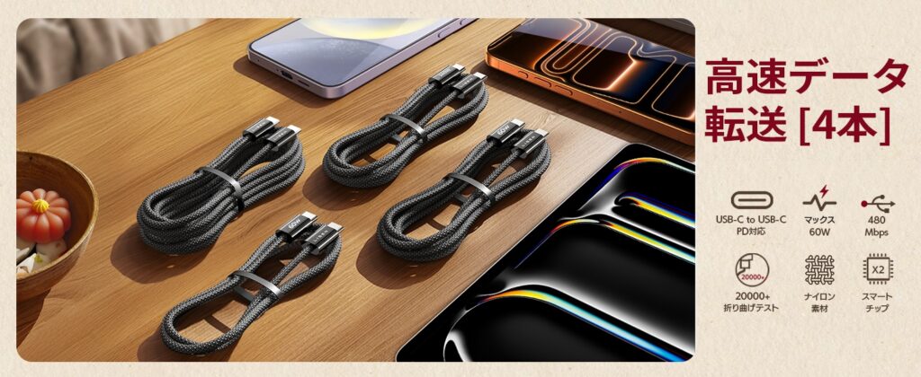 今回のような60W PD対応ケーブルは “とりあえず持っておく1本” としてかなり使い勝手が良いです。