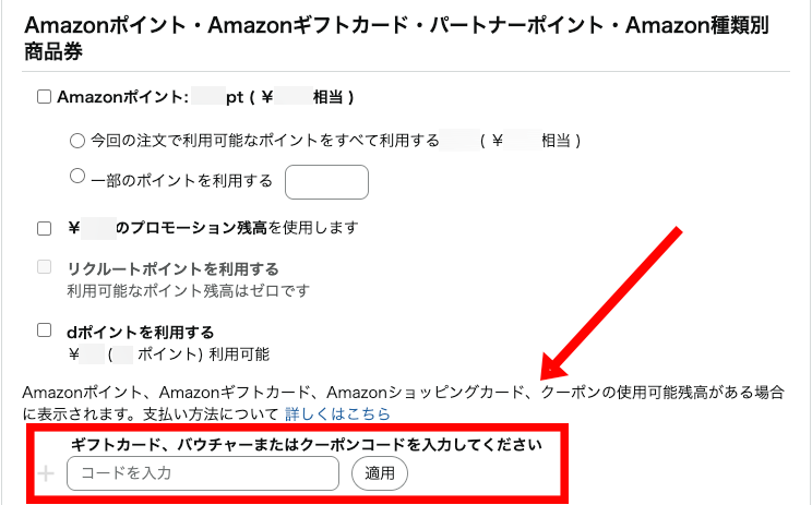 赤枠の「ギフトカード、バウチャーまたはクーポンコードを入力してください」にクーポンを入力し、適用を押してもらうと割引が適用されます。