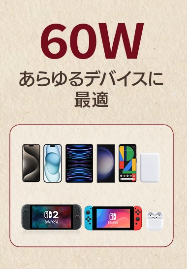 - 60W PD充電対応でスマホ〜ノートPCまで幅広く充電できる