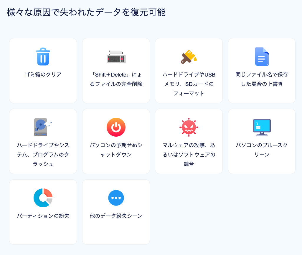 パソコン本体のストレージだけでなく、USBメモリやSDカード、外付けHDDなどの外部ストレージにも対応しており、写真・動画・文書ファイルなど、日常的によく使うデータを幅広く復旧対象としています。