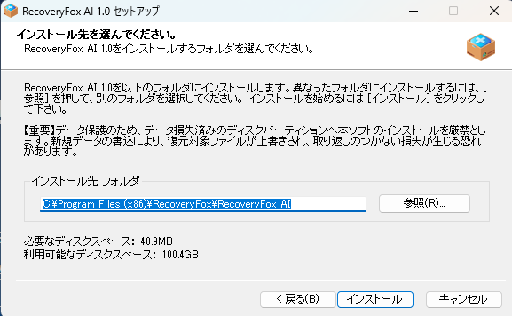 復元対象のドライブにはRecoveryFoxAIのソフトはインストールしてはいけない