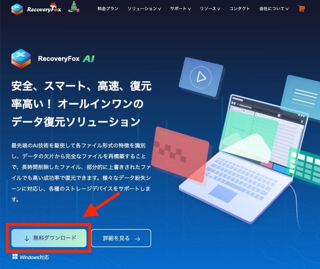 RecoveryFox AIの公式サイトより、以下の「↓無料ダウンロード」よりダウンロードを行います。