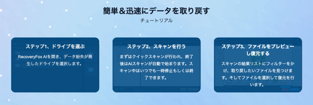RecoveryFox Aiの特徴は、一般ユーザーでも迷わず使えるシンプルさと、日常利用で困りがちなデータトラブルに幅広く対応している点です。