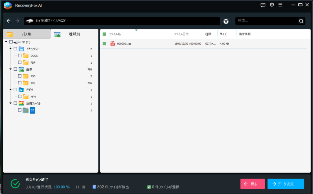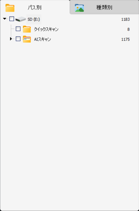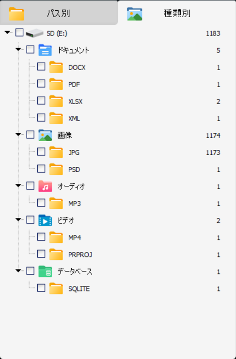 復元結果は、「パス別」と「種類別」に分かれて確認が可能です。