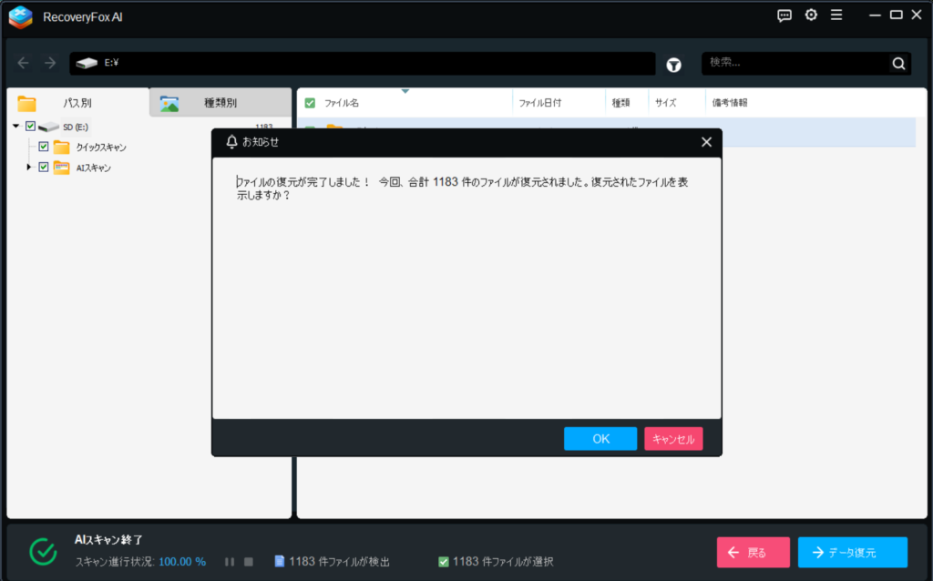 「クイックスキャン」で検出出来たデータは高確率で復元できそうな印象です。
