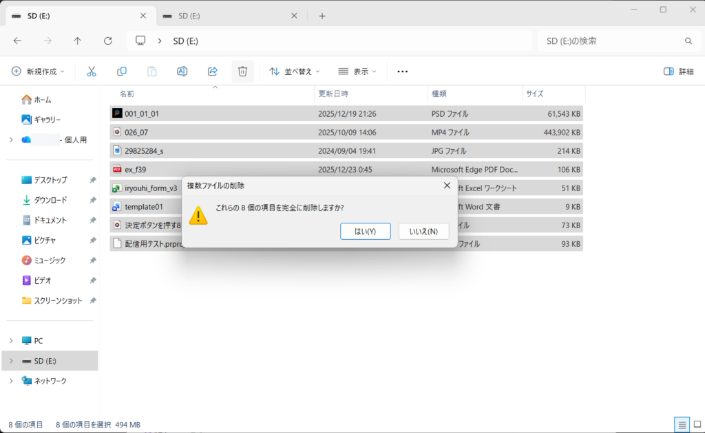 JPGやMP4ファイル、Office系ファイル、AdobeのPhotoshopやPremiereProのファイルなど8ファイルを保存して、削除してみます。