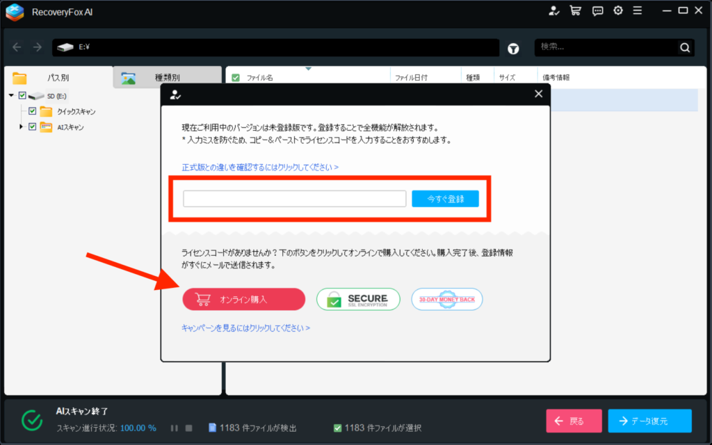 復元ボタンを押すと、ライセンス購入画面が現れます。