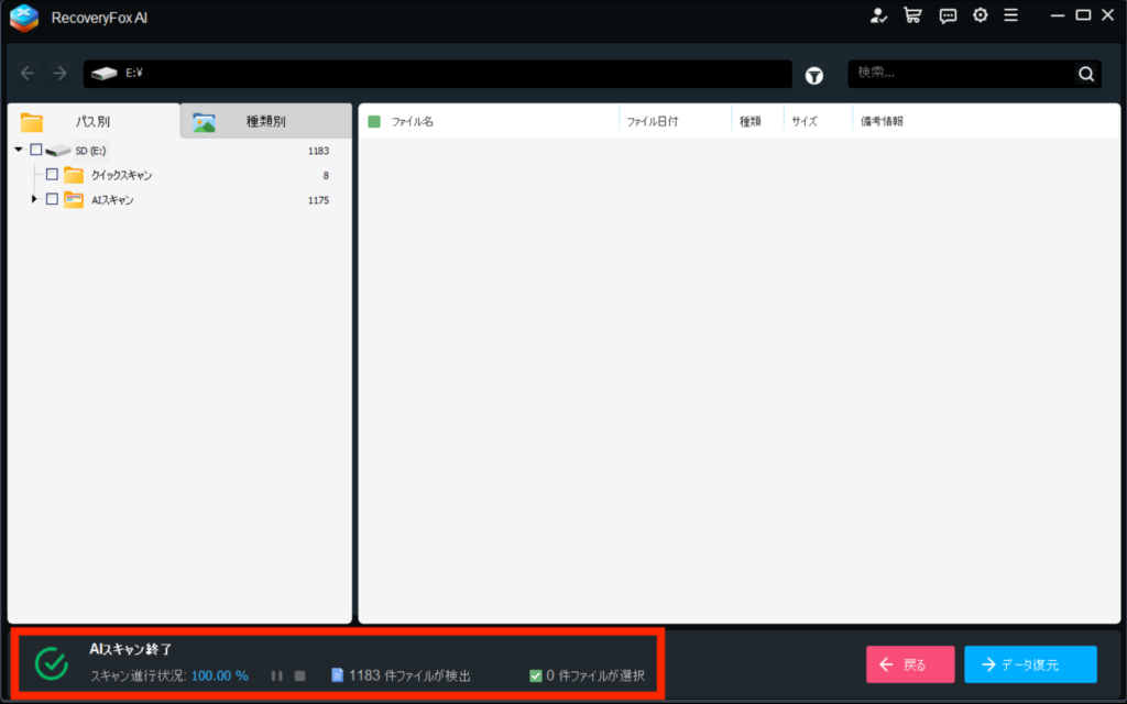 また、RecoveryFoxAIのソフトがインストールされているドライブに保存されていたデータを削除した場合も、データの検出・復元もできませんでした。